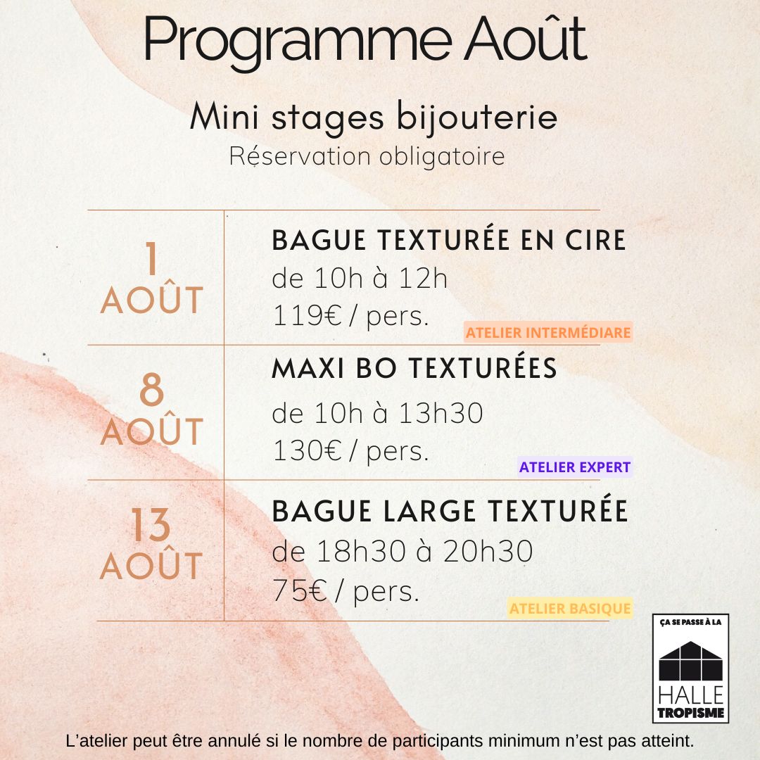NOTE: En aucun cas la formatrice ne saurait garantir, ni être tenue responsable du résultat esthétique et technique du bijou fabriqué par le stagiaire. Plus d’infos, voir les CGVU des Ateliers