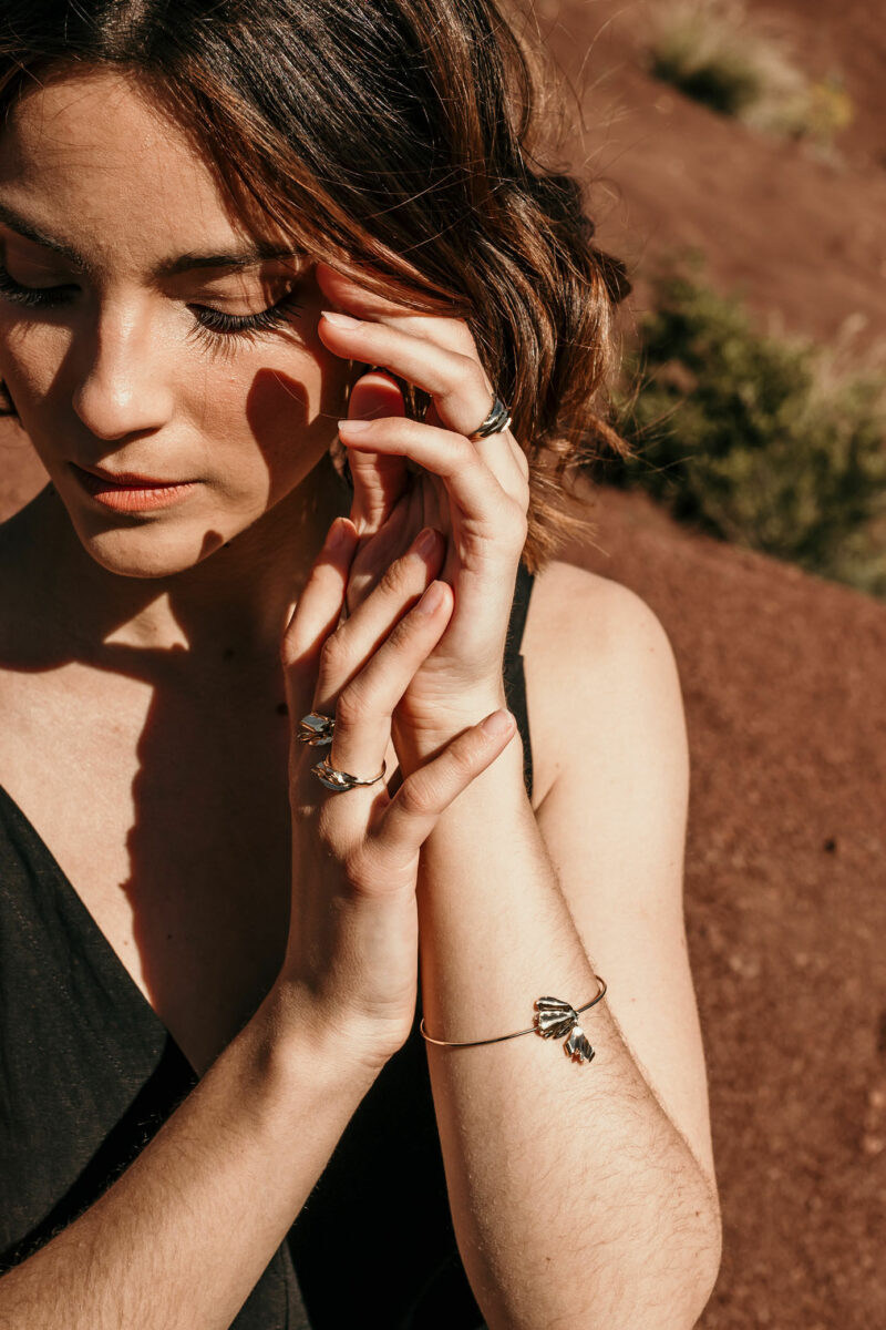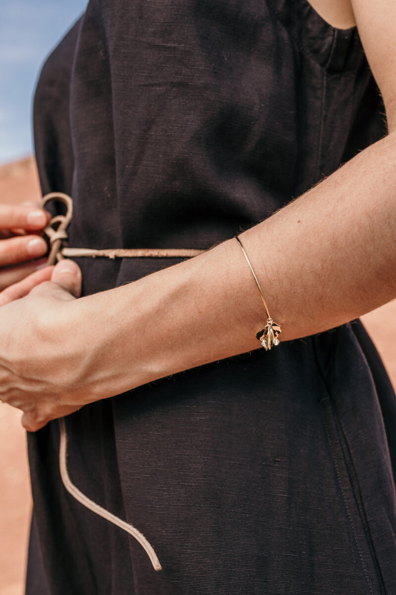Un jonc pétales de pivoine André à votre poignet pour une touche simple et délicate. Vous apprécierez le pétale figé dans un mouvement tandis qu’un second glisse le long du jonc. Chaque bijou est fabriqué à la main, votre jonc est unique.